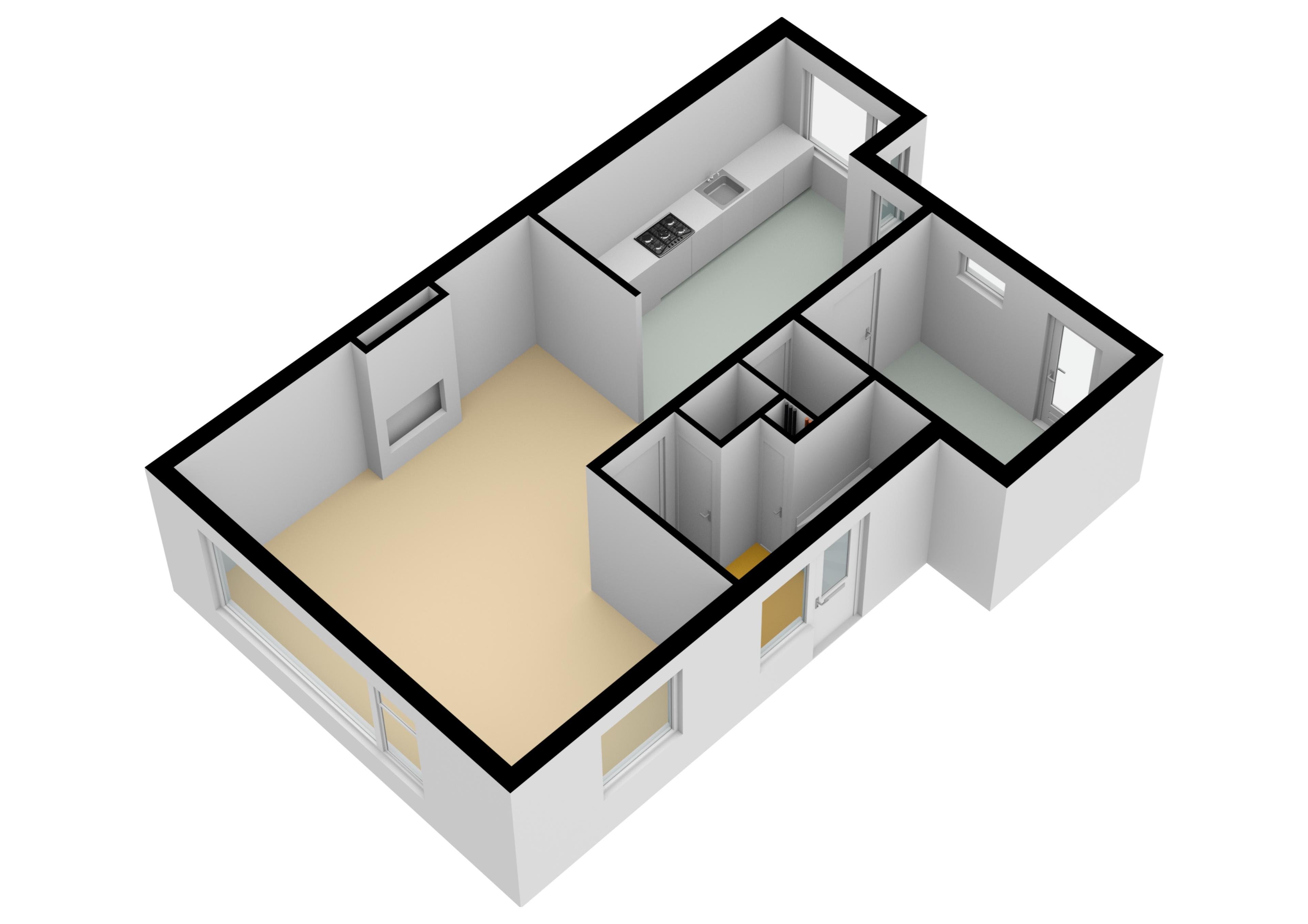 Zijentree/hal met trapopgang, meterkast en toilet, woonkamer met rookkanaal, kelderkast, uitgebouwde eetkeuken (keuken met gaskookplaat en afzuigkap), ruime bijkeuken met wasmachineaansluiting.