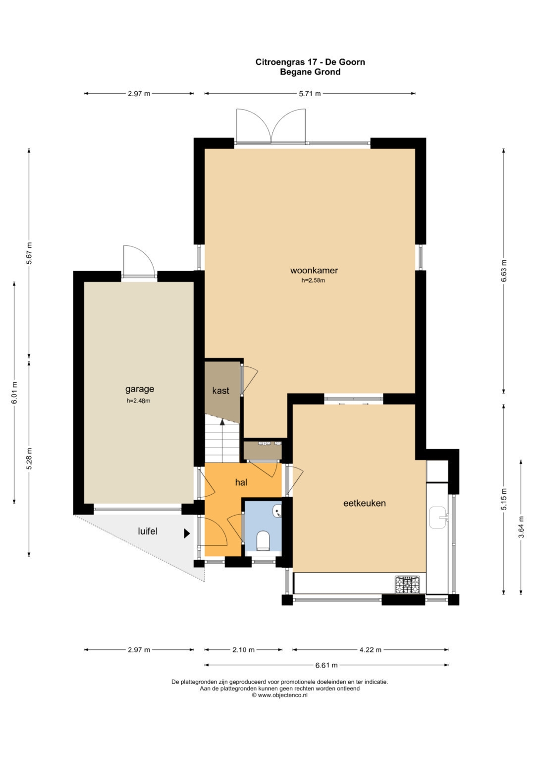 Entree/hal met meterkast, modern toilet, toegang naar garage met elektrische sectionale garagedeur, trapopgang, ruime eetkeuken voorzien van schouw, 5 pits gaskookplaat, vaatwasser, koelkast , granieten aanrechtblad. Tuingerichte woonkamer en suite met bergkast en openslaande tuindeuren.