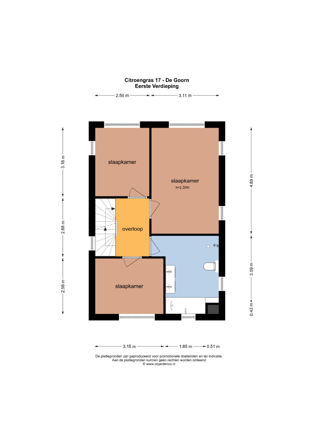 Overloop, 3 slaapkamers, badkamer met douche, 2e toilet, ligbad en wastafelmeubel.