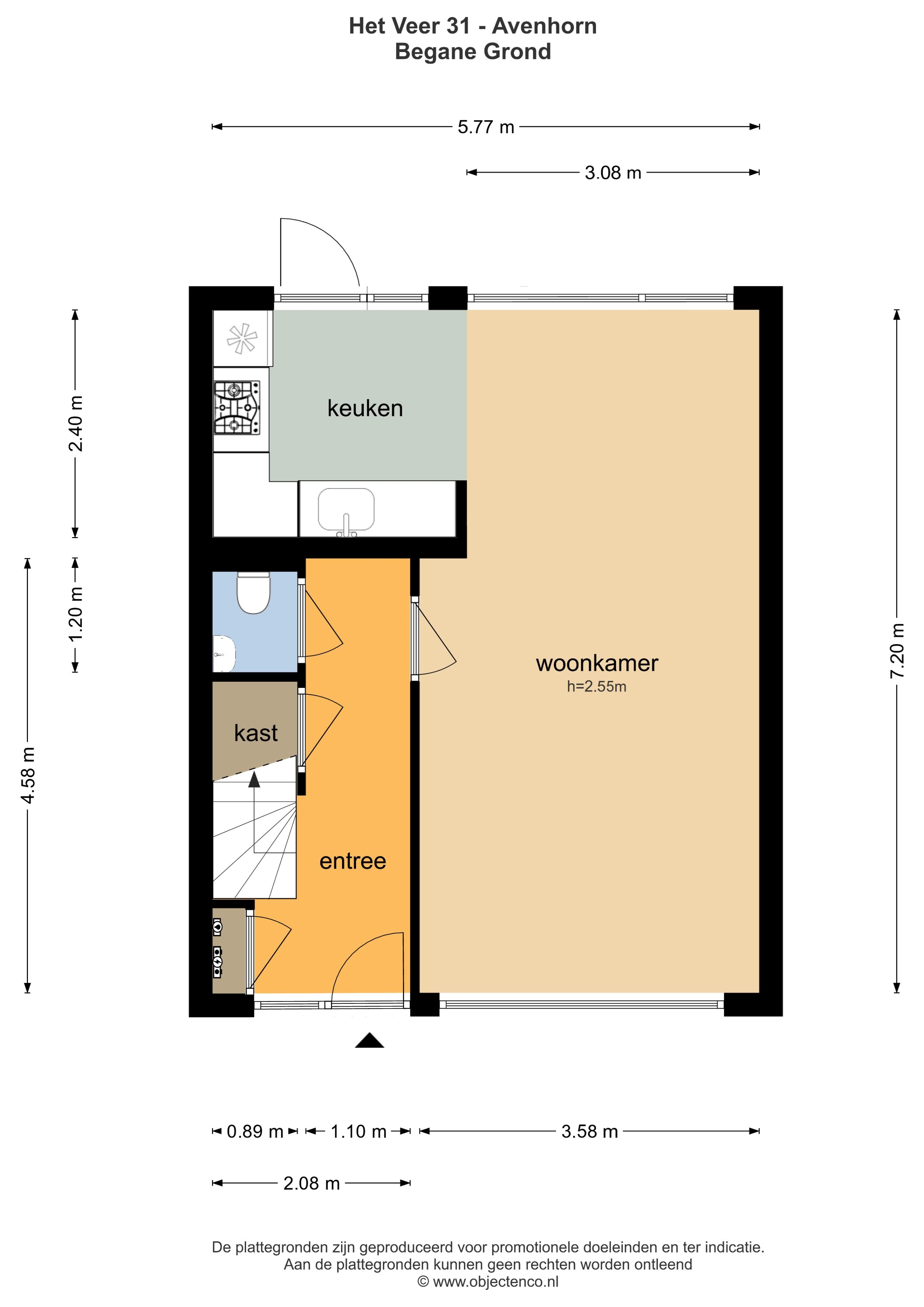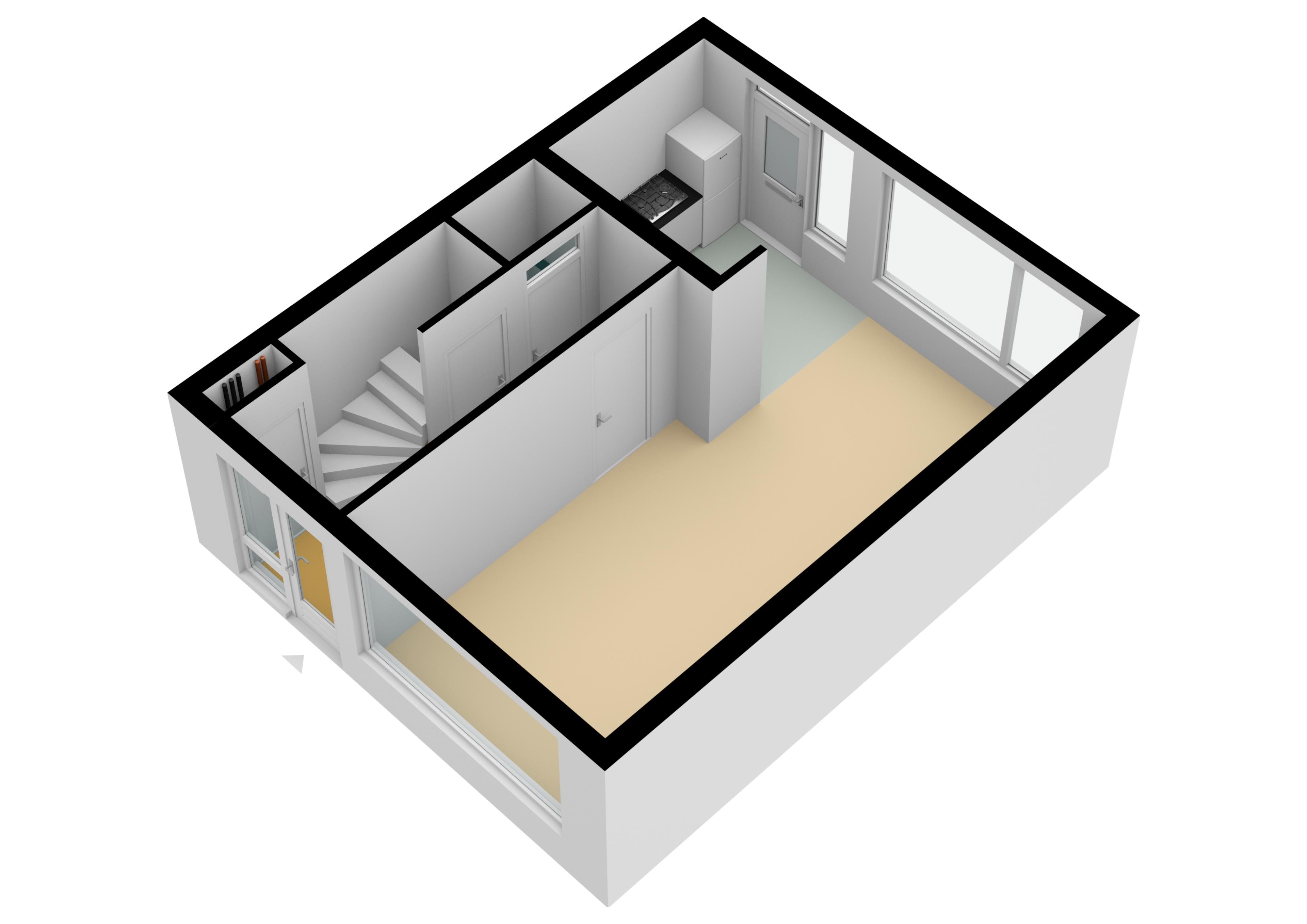 Entree/hal met meterkast, trapopgang, trapkast en toilet. Lichte woonkamer, hoekkeuken v.v. inbouwapparatuur zoals vaatwasser, gaskookplaat, combi oven, koel/vriescombinatie.