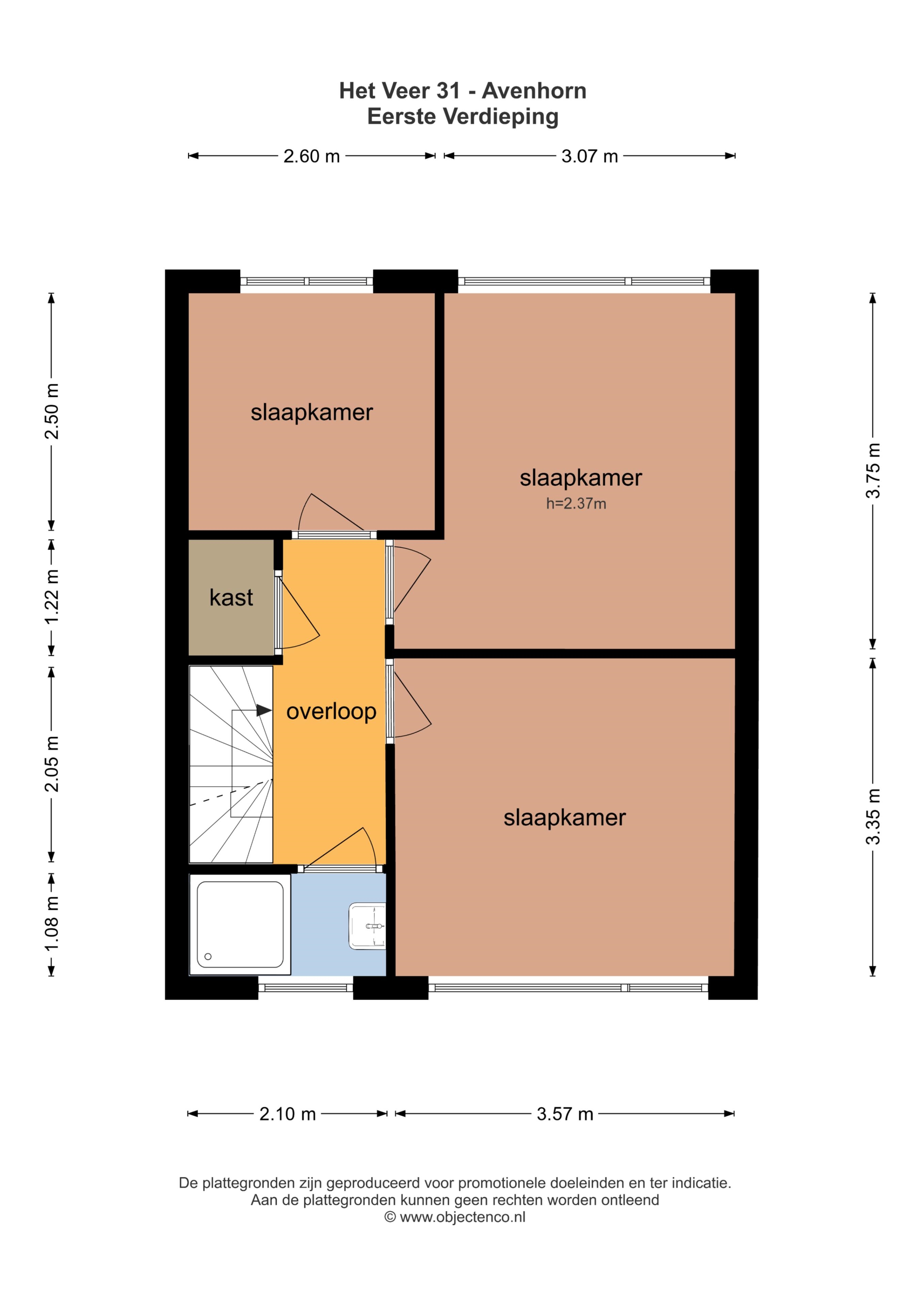 Overloop, bergkast, 3 slaapkamers en een douche met designradiator en wastafel.