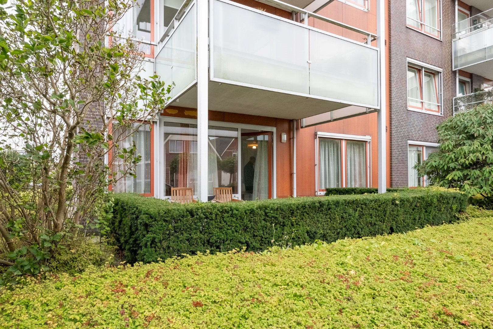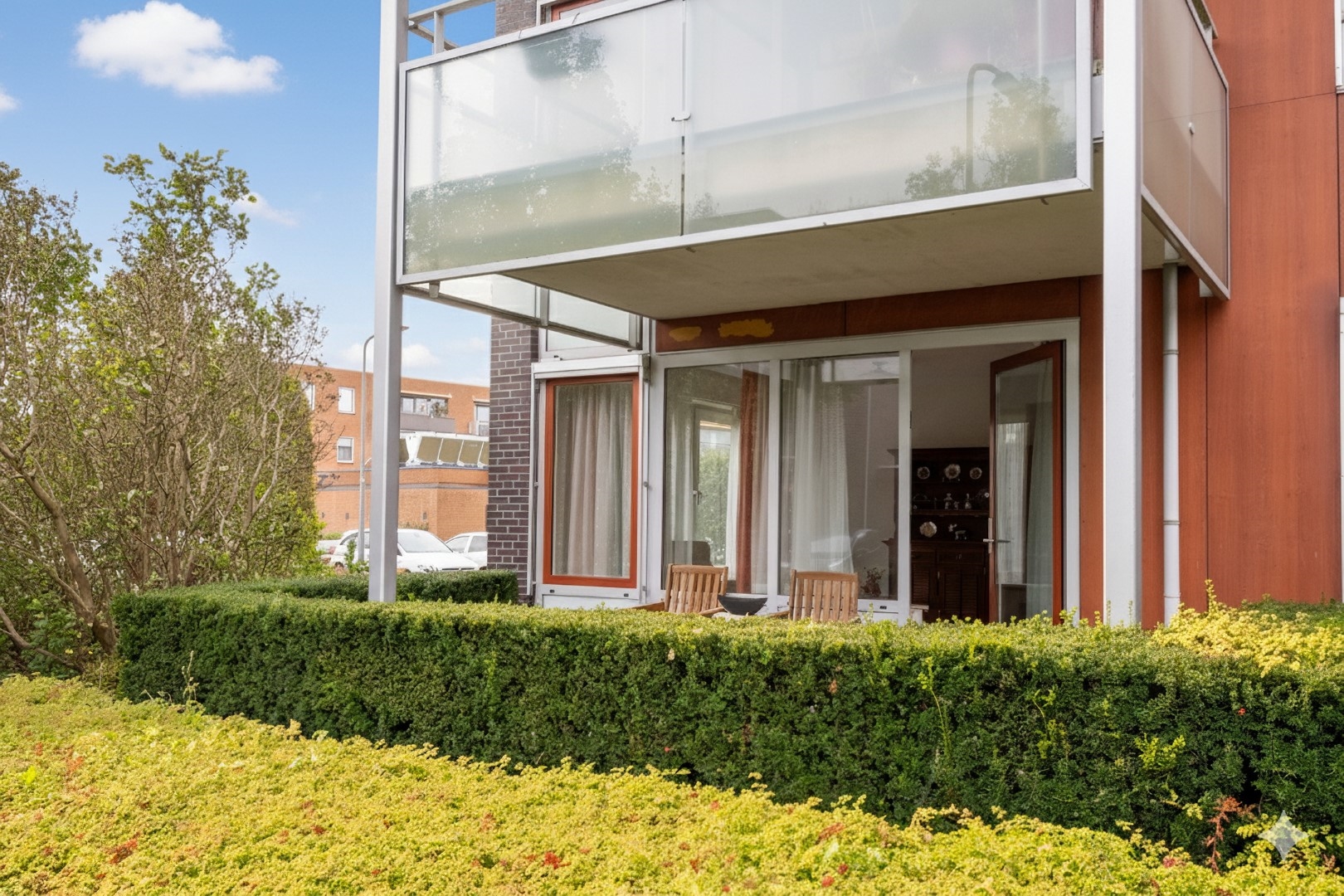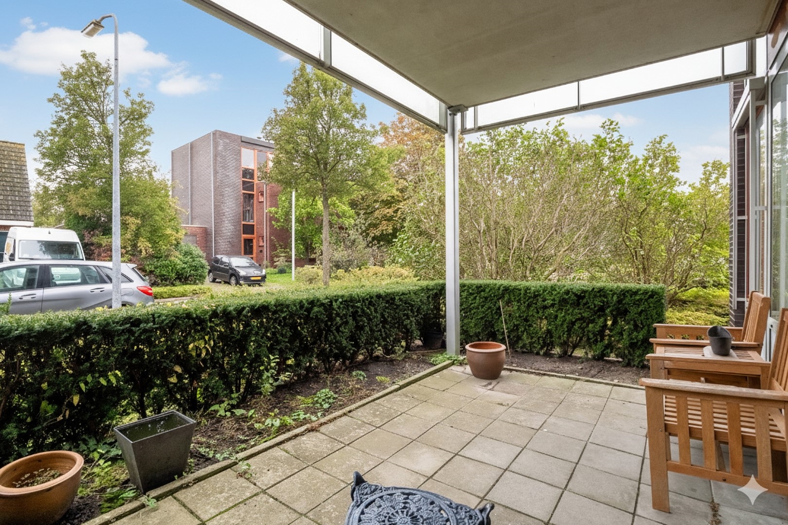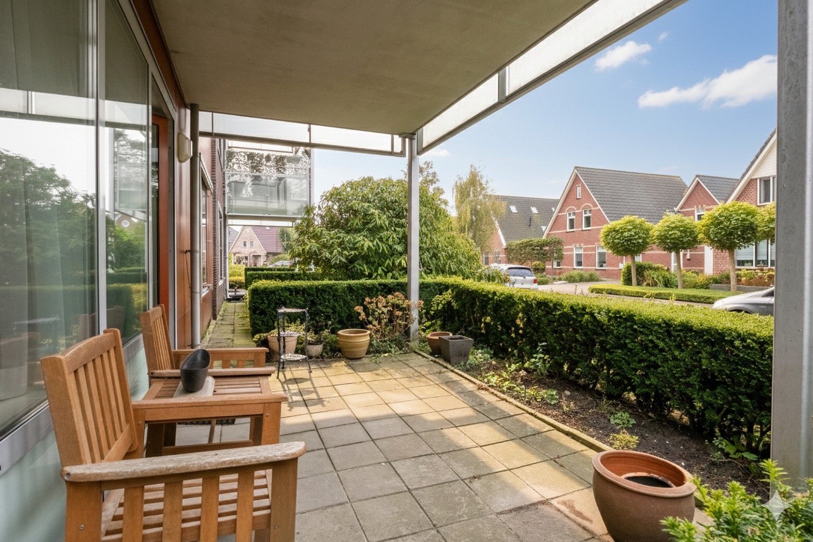 Eigen terras aan de zonkant met uitzicht op openbaar groen.