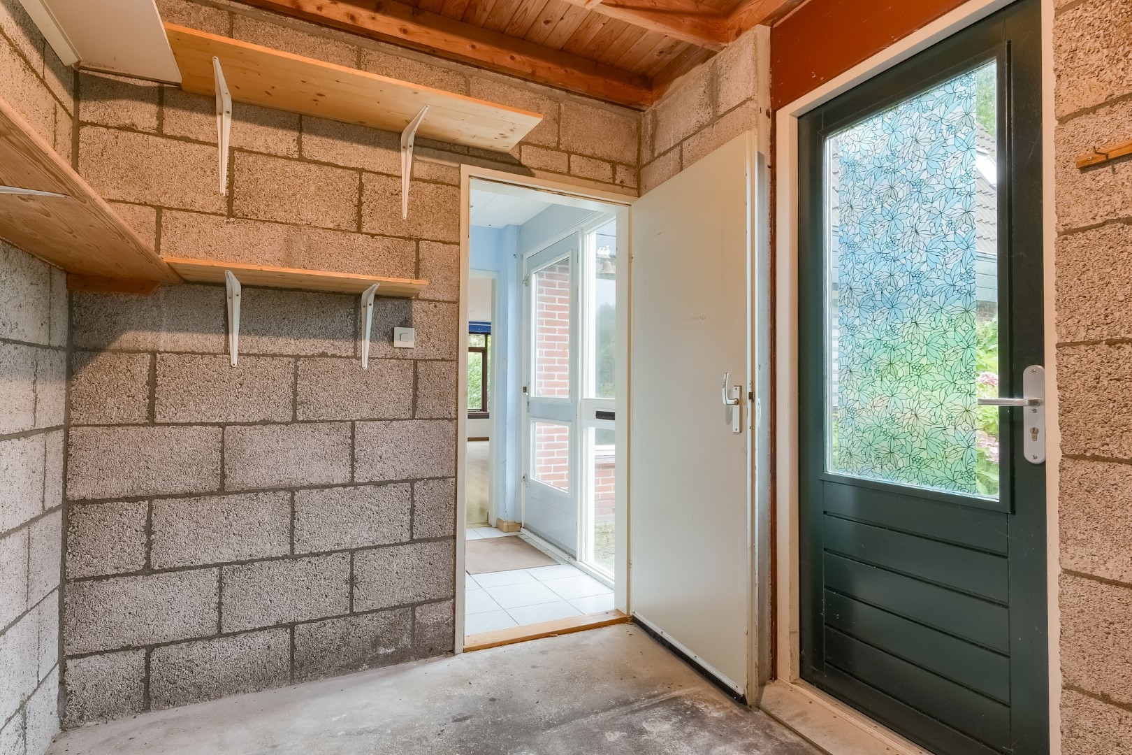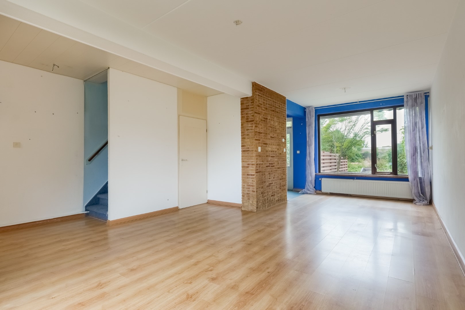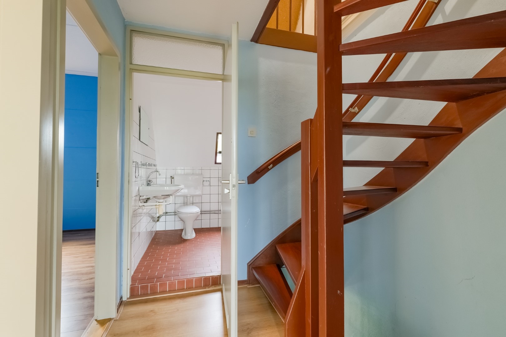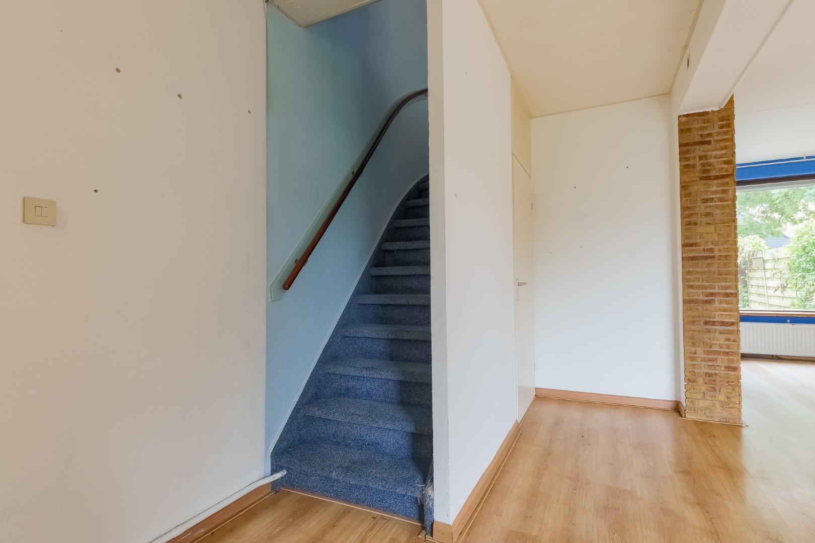Entree/hal met toegang naar berging, toilet, meterkast. Woonkamer met trapopgang en trapkast, eenvoudige keuken.