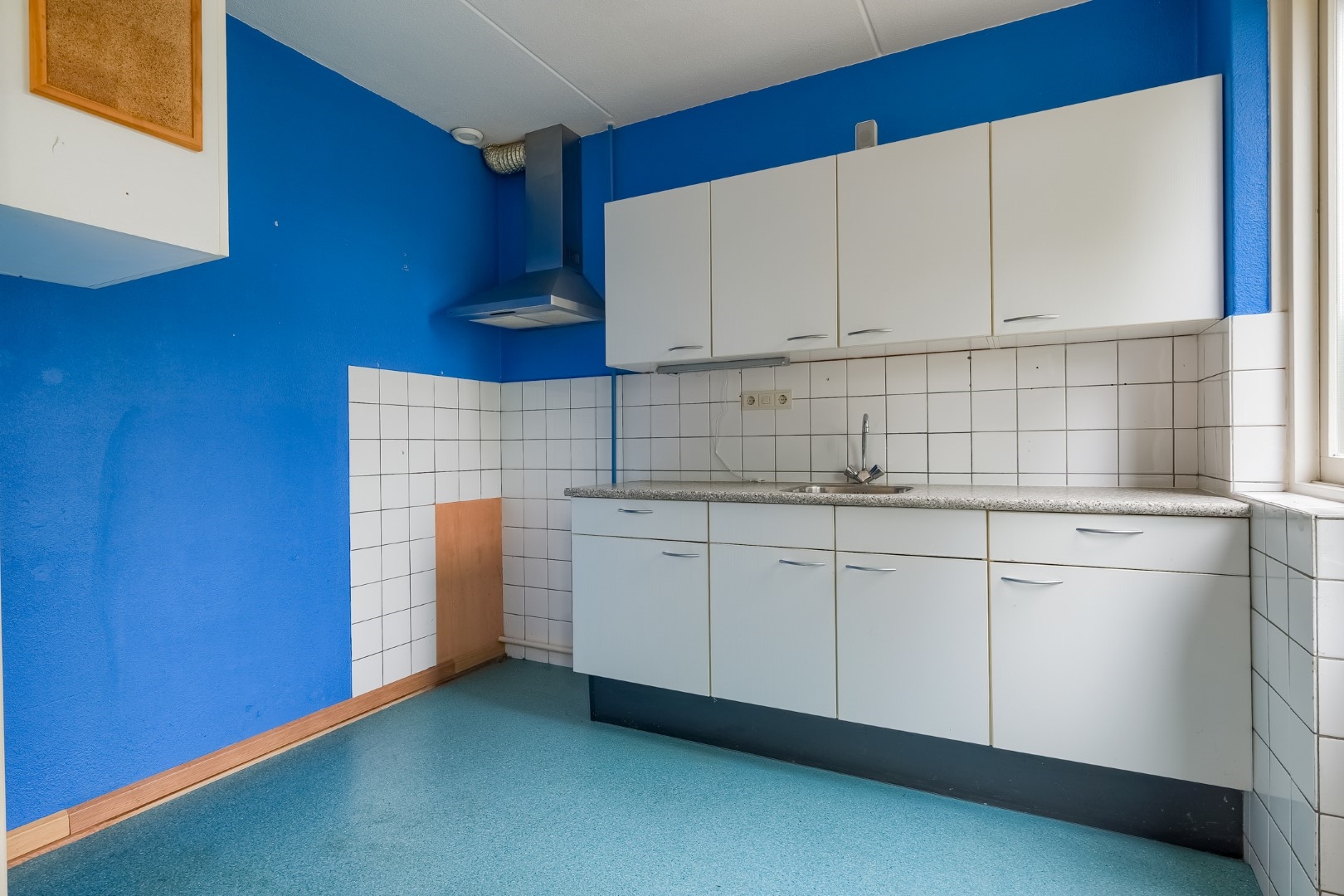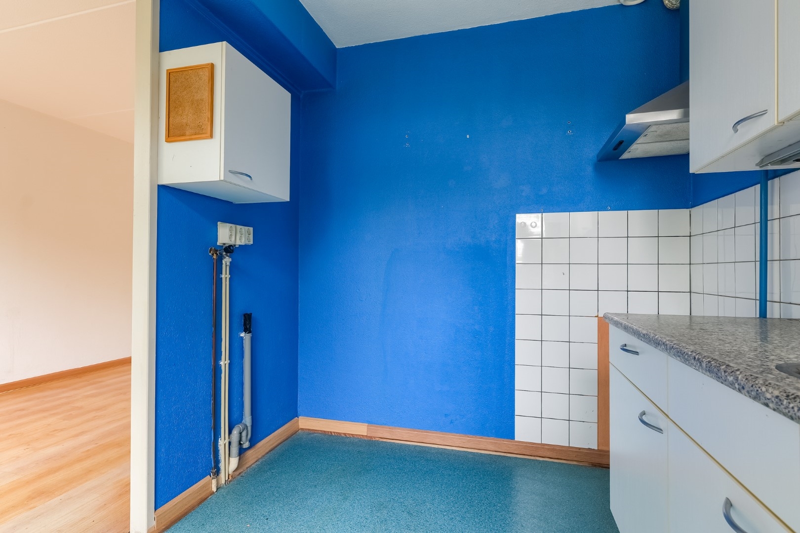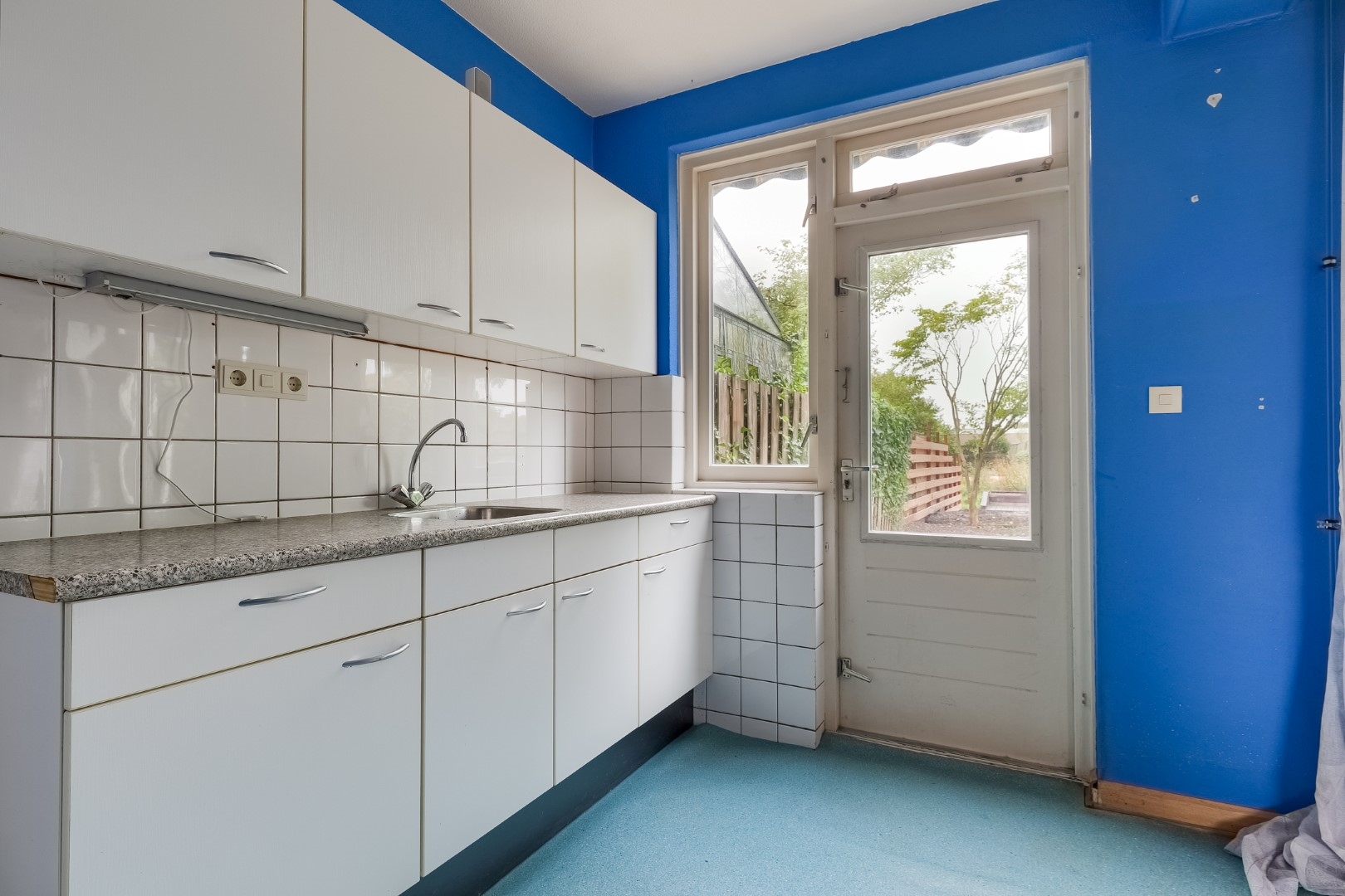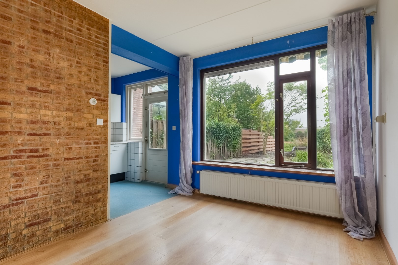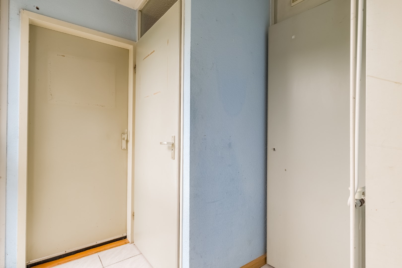 Entree/hal met toegang naar berging, toilet, meterkast. Woonkamer met trapopgang en trapkast, eenvoudige keuken.