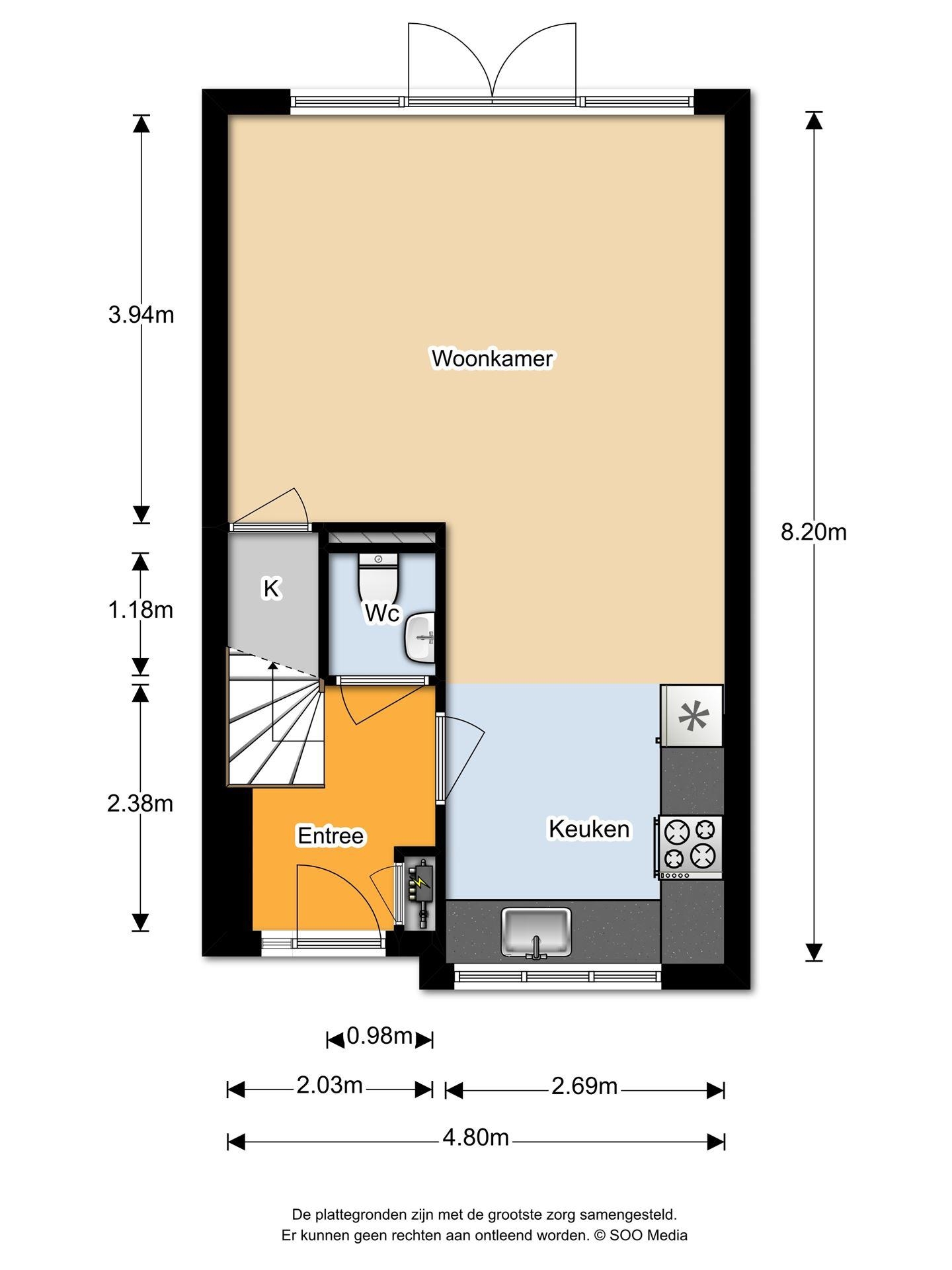 Entree/hal met meterkast, toilet en trapopgang. Lichte keuken in hoekopstelling en voorzien van inbouwapparatuur, woonkamer met bergkast en openslaande tuindeuren.