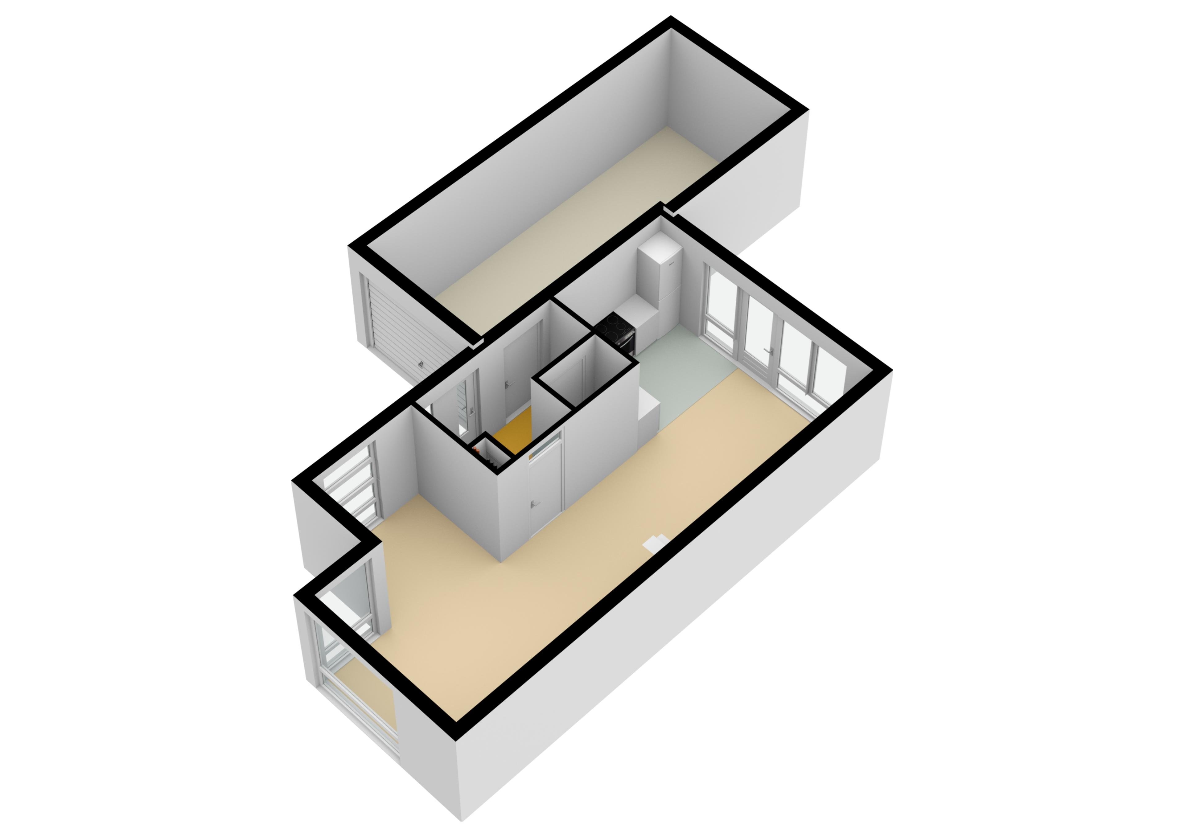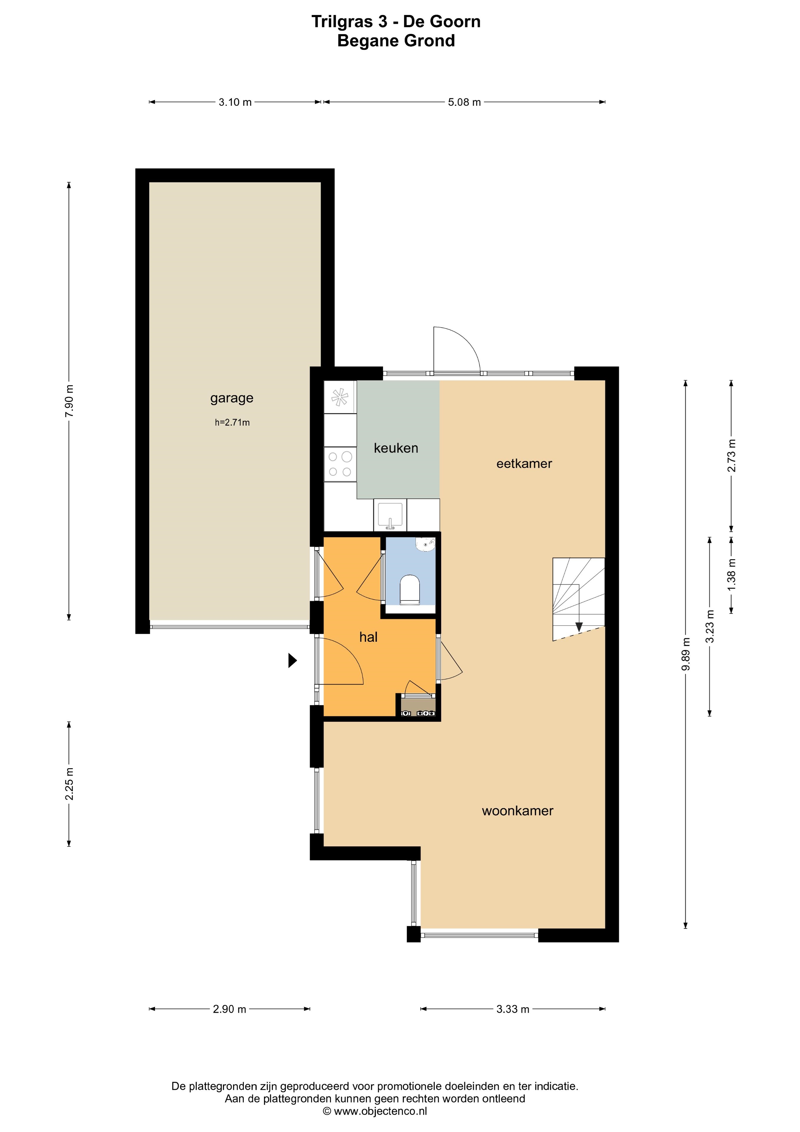 Entree/hal met meterkast, toilet, toegang naar vergrote garage, woonkamer met trapopgang, hoekkeuken voorzien van inbouwapparatuur, deur naar tuin.