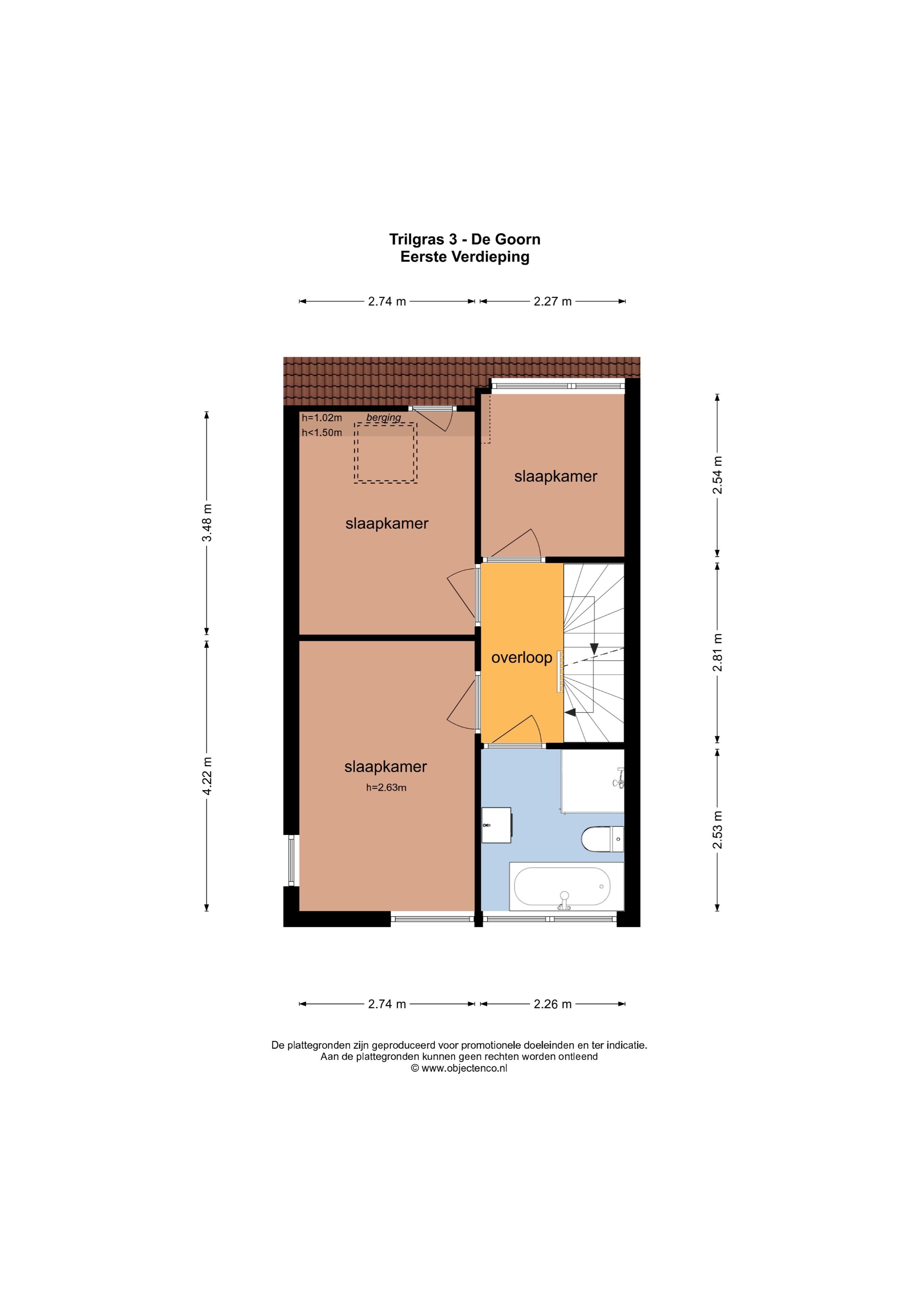 Overloop, 3 slaapkamers en badkamer voorzien van ligbad, douche, 2e toilet en wastafelmeubel.