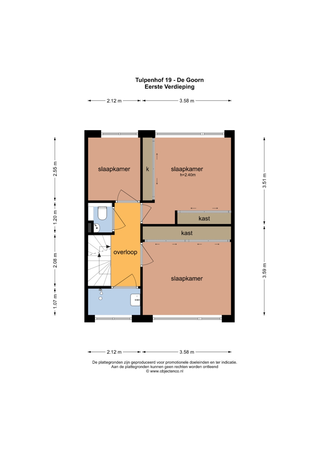 Overloop, separaat toilet, douche met wastafelmeubel en designradiator, 3 slaapkamers met vaste kasten.