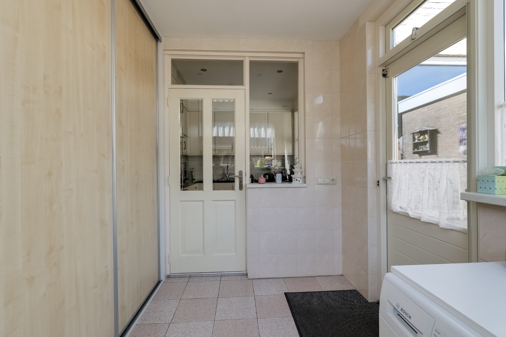 Entree/hal met meterkast, trapopgang, trapkast en modern toilet, woonkamer, keuken met inbouwapparatuur en royale bijkeuken.