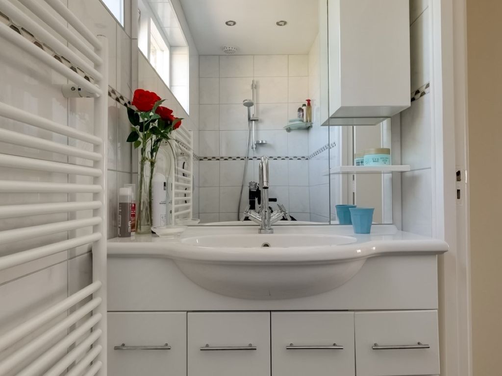 Overloop, separaat toilet, badkamer met douche, designradiator en wastafelmeubel, 3 slaapkamers waarvan 2 met vaste kasten.