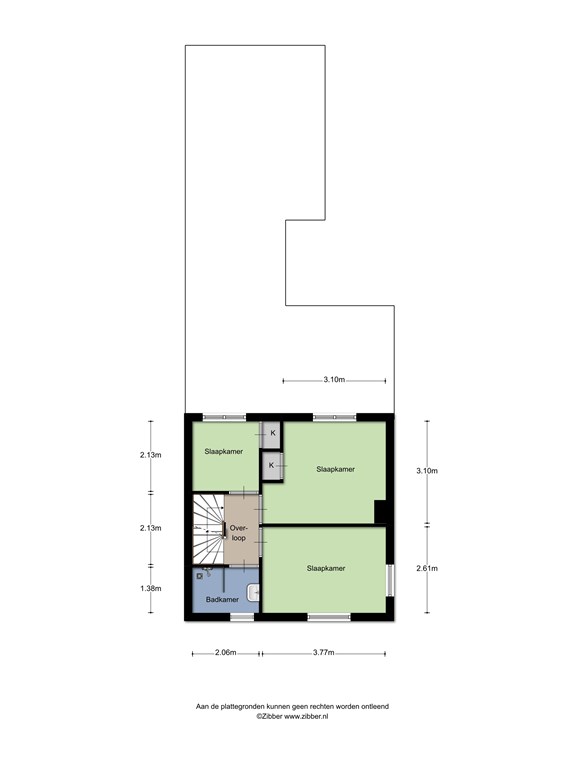 Overloop, 3 slaapkamers en doucheruimte met wastafel.