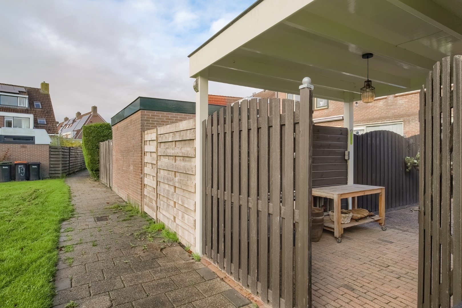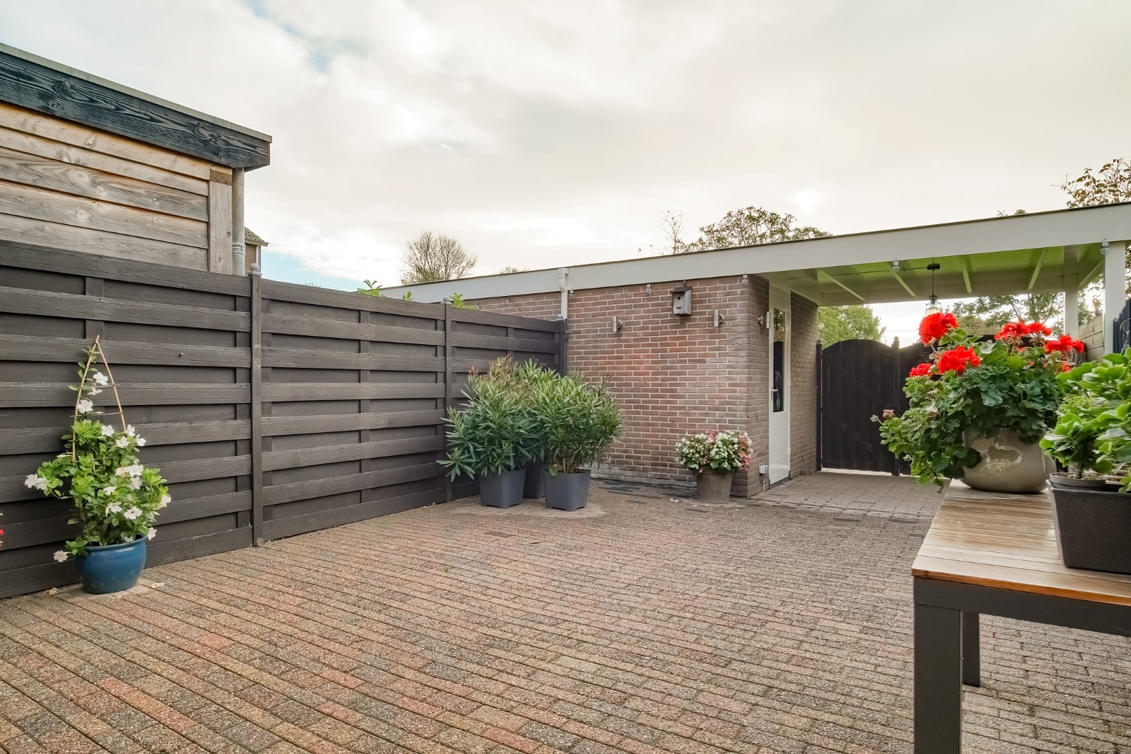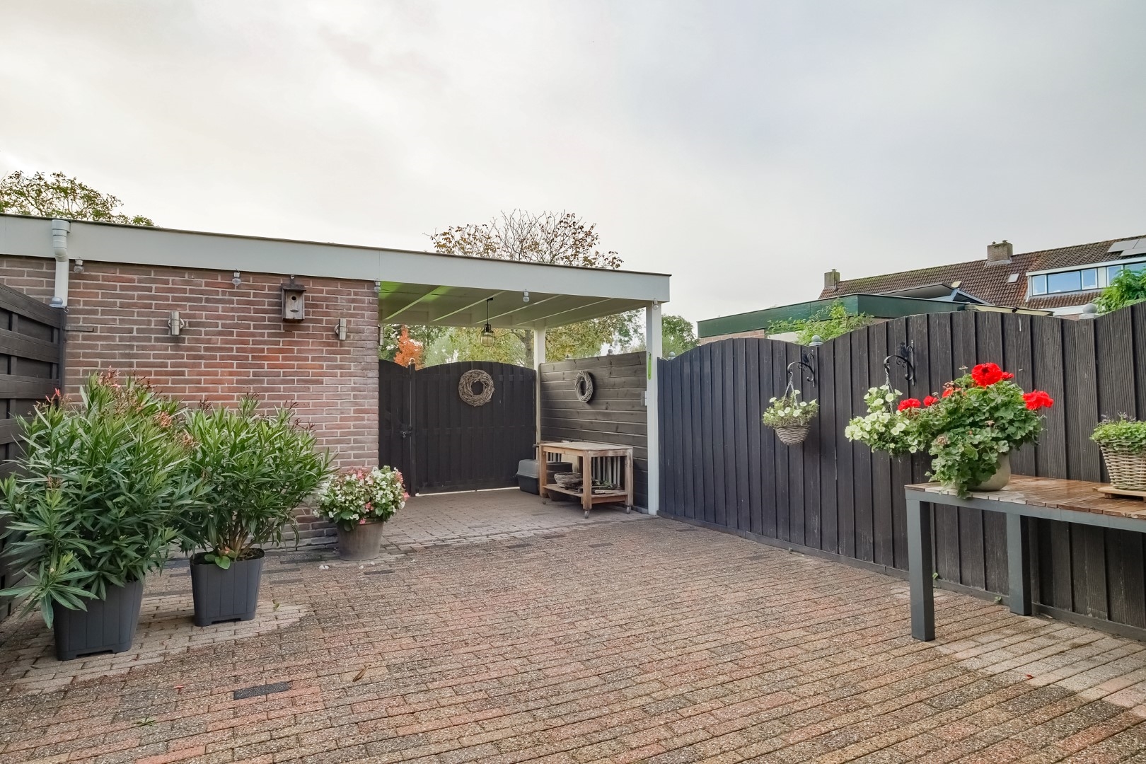 Knusse besloten achtertuin op het zuidoosten met berging en overkapping.