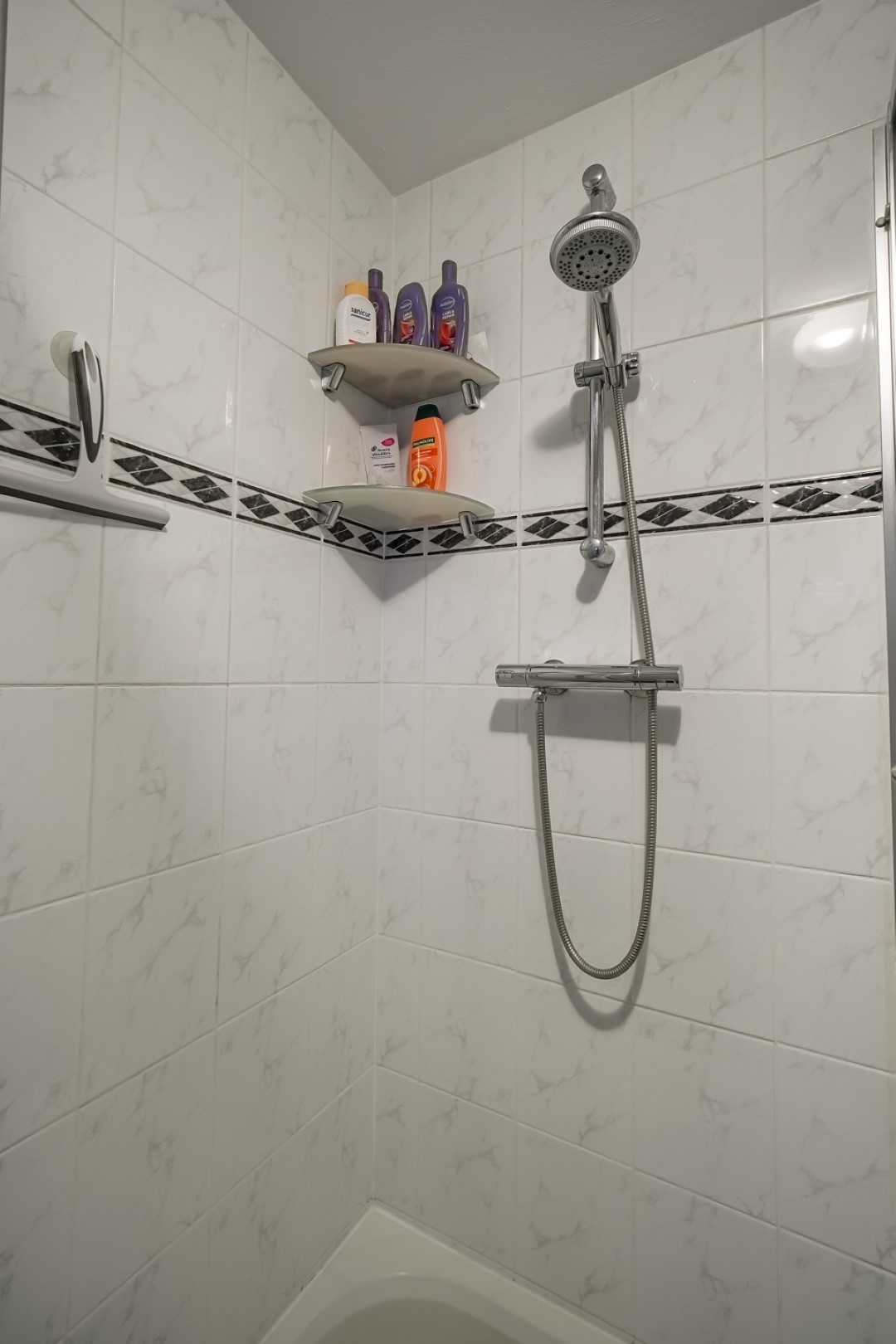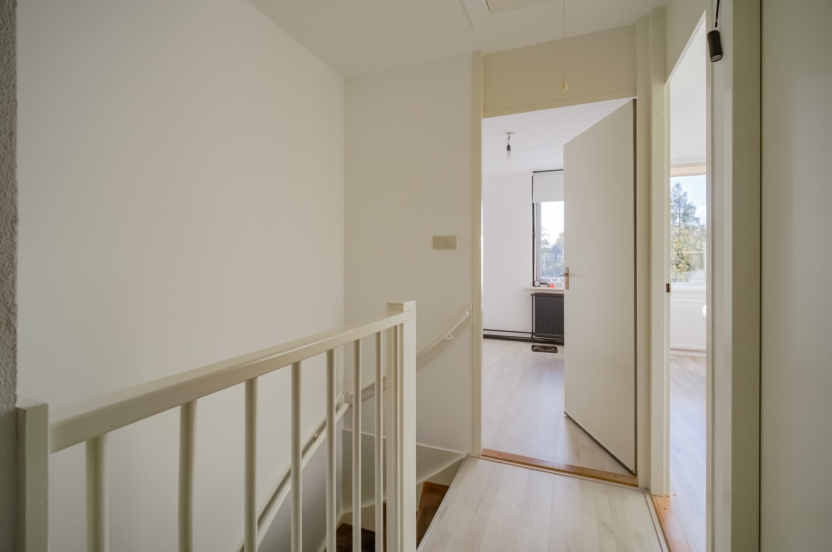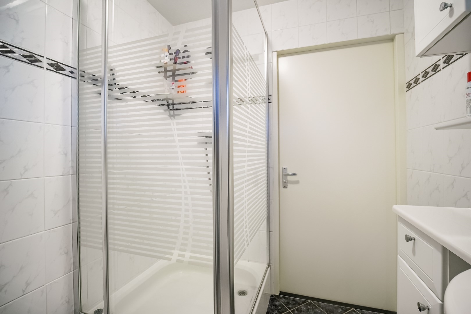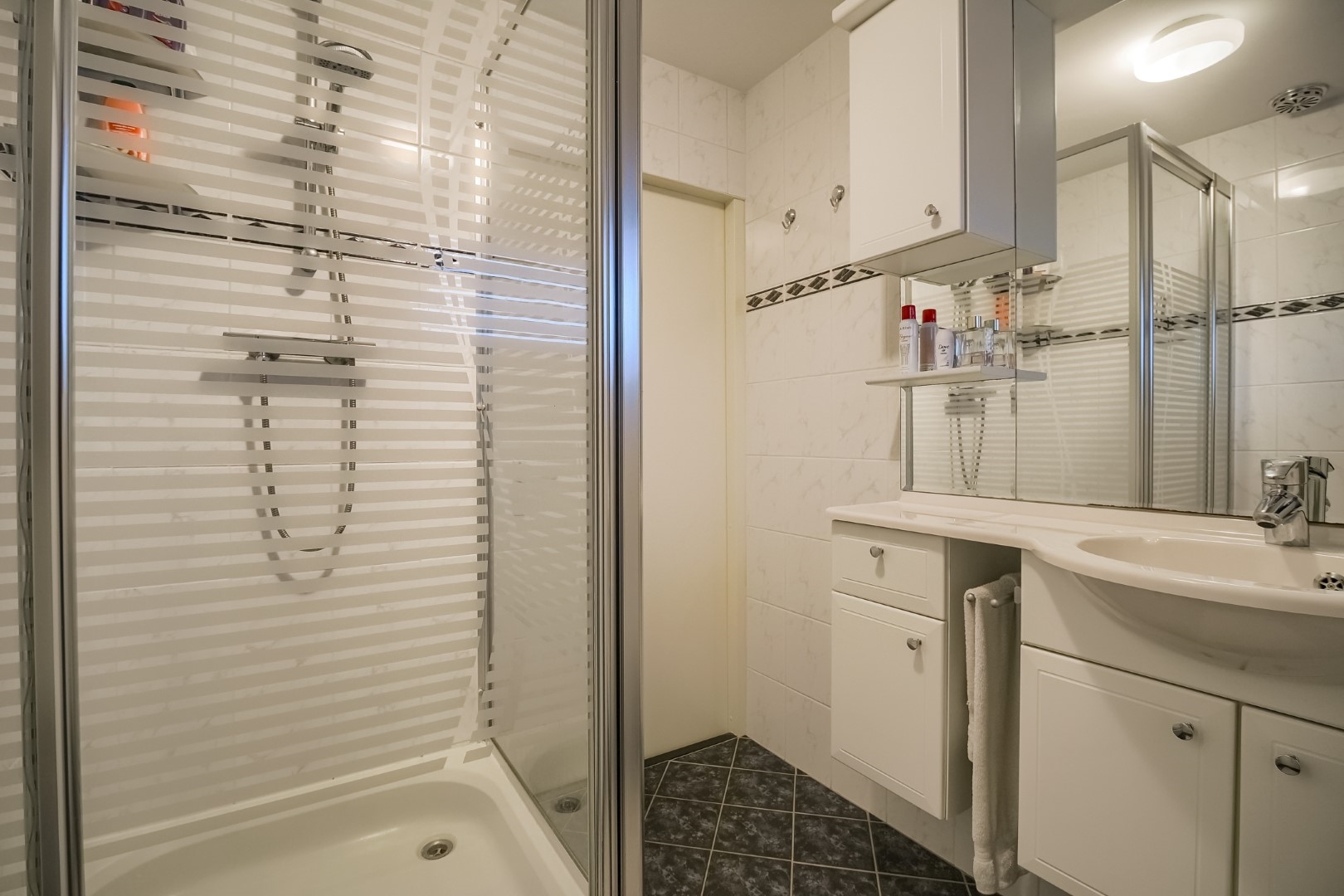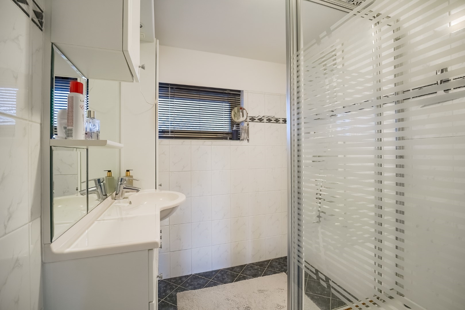 Overloop met bergkast, 3 slaapkamers en badkamer met douchecabine, designradiator en wastafelmeubel.